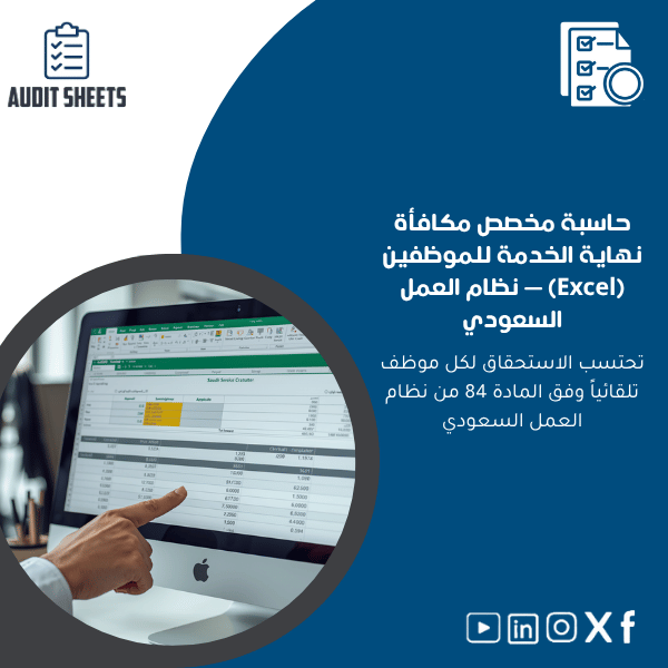 تعتبر أوراق عمل مراجعة الحسابات من الأدوات الأساسية التي تساعد المحاسبين والمدققين في تنظيم وإدارة الأعمال المالية بكفاءة. ومن بين هذه الأدوات، يأتي حاسبة مخصص مكافأة نهاية الخدمة للموظفين كأداة فريدة ومميزة تُقدم حلولاً متكاملة لحساب المكافآت المستحقة للموظفين وفقاً لأحكام المادة 84 من نظام العمل السعودي. هذا المنتج يوفر لك القدرة على إدارة العمليات المالية بشكل أكثر دقة وفعالية.